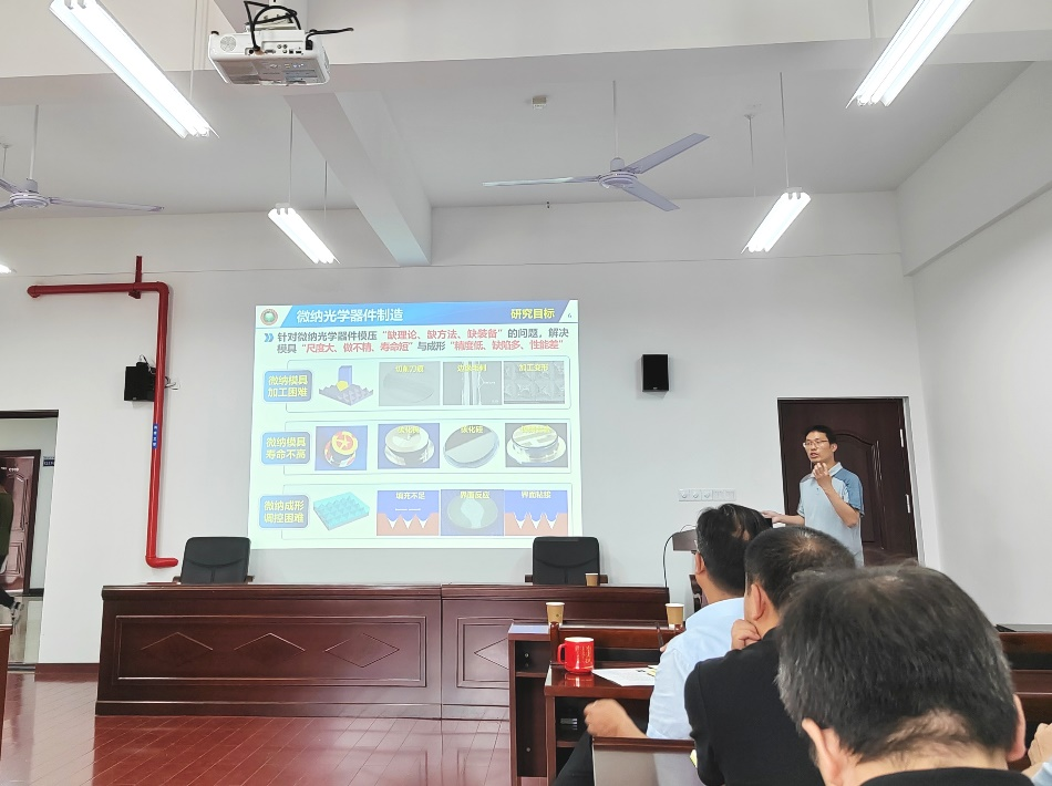 本次报告的主题为《微纳光学器件模压制造技术及应用》,周教授首先从微纳光学器件在探测制导、激光雷达、光学成像、激光光源等领域的应用需求为切入点,介绍了微纳光学器件制造面临的难题,由此周教授介绍了其在超精密制造、微纳制造、光学制造交叉融合方法与技术的研究成果,包括建立了复杂微纳光器件跨尺度、高性能、高效率制造理论;在光学器件的模压制造领域,通过理论与方法创新,建立了微纳模具超精密制造、高温玻璃模压成形新工艺新方法,为解决微纳光学自由曲面镜片制造的共性关键技术问题提供了可靠解决方案;在微结构结构切削和磨削加工领域,建立了微纳结构形状尺度控制方法,有效控制了加工变形,同时建立了微纳结构变剪切角非自由切削模型,揭示了微尺度下切削过程剪切干涩和加工变形机理,形成了微纳结构非自由切削理论。周教授还介绍了其在飞切加工领域的创新性成果,展示了飞切加工出的微纳尺度棱锥阵列和两级沟槽阵列等复杂结构,并介绍了相关应用案例。