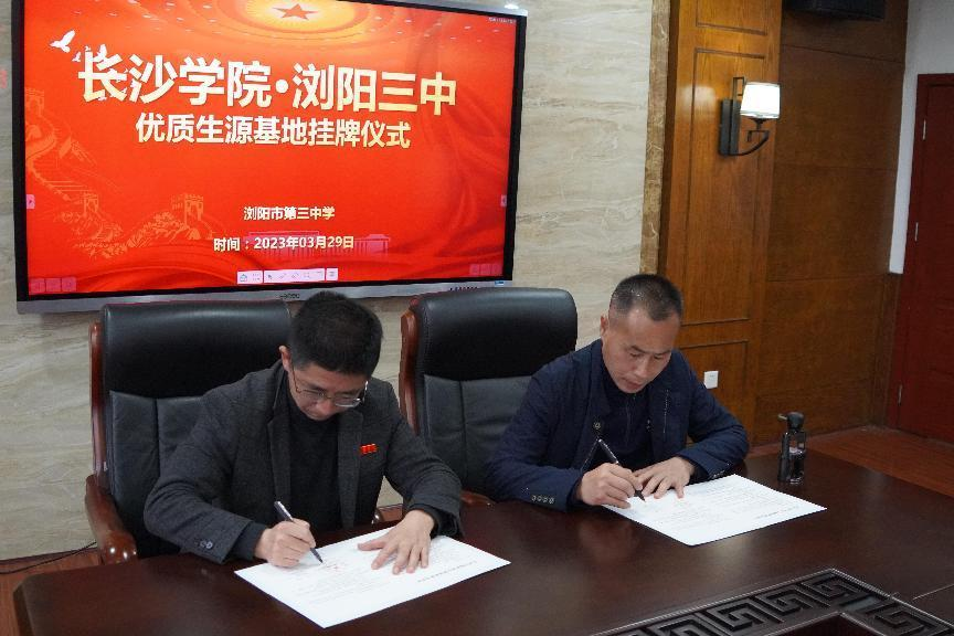 随后,双方与会领导签署了优质生源基地合作协议,张海涛书记代表学校为浏阳市第三中学授予“长沙学院优质生源地”牌匾。我校也将以此为契机和动力,加快学院发展,引进更多优质生源,共同培养优秀人才。