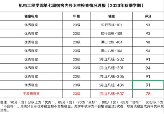 为了加强我院宿舍卫生文明建设,营造良好的学习生活环境,促进学生的健康成长,现将2023年秋季学期第七周宿舍检查结果通报如下: