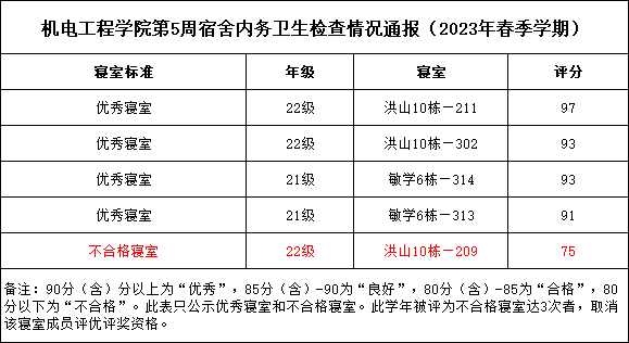 在此,对优秀寝室提出表扬,望再接再厉。对不合格寝室(洪山10栋209)提出通报批评。请不合格寝室立即整改,根据我院“校园劳动日”方案,若一学期被评不合格次数达3次,将取消该寝室成员的评优评奖资格。请广大同学们注重劳动实践,在宿舍禁烟控酒,养成良好生活习惯,不使用违规电器,共同营造健康、舒适、整洁、和谐的宿舍环境。