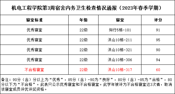 在此,对优秀寝室提出表扬,望再接再厉。对不合格寝室(洪山10栋317)提出通报批评。请不合格寝室立即整改,根据我院“校园劳动日”方案,若一学期被评不合格次数达3次,将取消该寝室成员的评优评奖资格。请广大同学们注重劳动实践,在宿舍禁烟控酒,养成良好生活习惯,不使用违规电器,共同营造健康、舒适、整洁、和谐的宿舍环境。