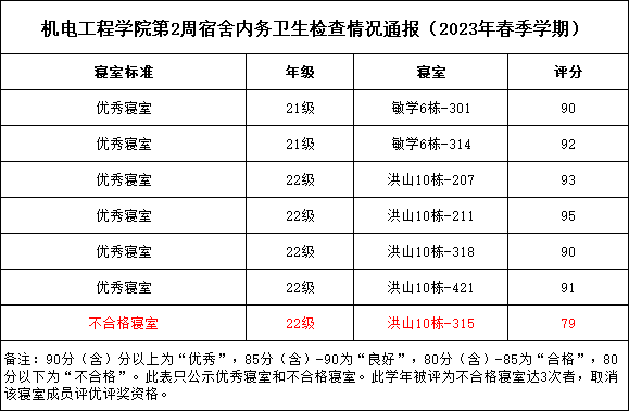 为了加强我院宿舍卫生文明建设,营造良好的学习生活环境,促进学生的健康成长,现将2023年春季学期第二周宿舍检查结果通报如下: