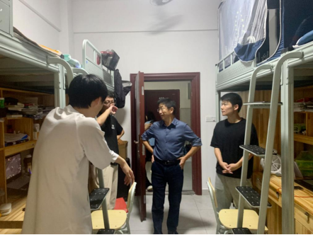 图2:机电工程学院党总支书记张海涛(左1)走访洪山7栋23级学生宿舍