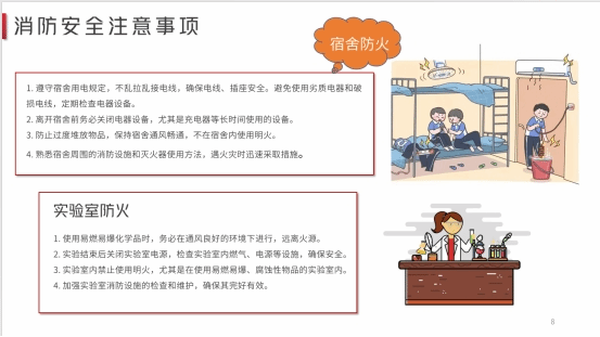 学院充分激发学院宿舍自主管理委员会、学院保卫部等学生安全部门成员的工作活力,由学生干部自主学习消防安全知识,并制作消防安全宣传PPT和主讲,于11月3日19:00,在长智楼C501报告厅开展消防安全讲座,从学生角度分享大家在平时校园学习和生活中应注意哪些安全事项。