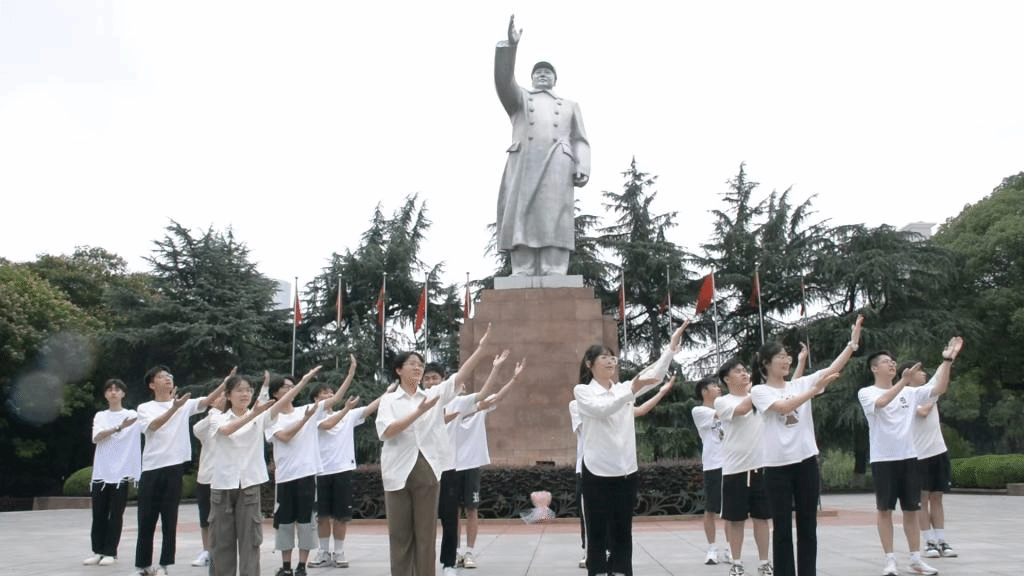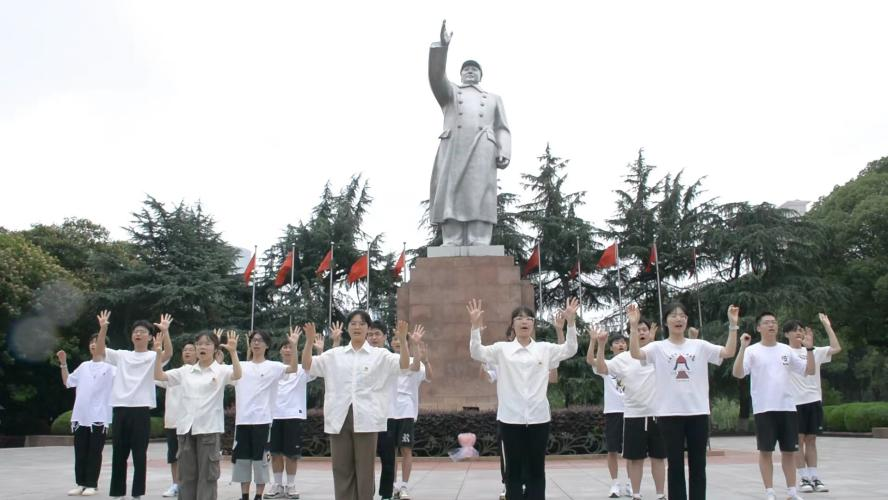 全体党员同志在毛主席塑像前表演手势舞。通过以美育人,将理论教育与实践养成相结合。手势舞旨在继承和激发爱国情,强国志,报国行,号召党支部同学们紧跟党走,做好党的助手和后备军,自觉践行社会主义核心价值观。