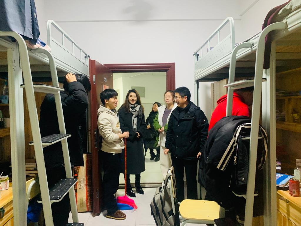新学期伊始,为进一步落实学校2023年春季开学工作会议精神,及时了解学生返校后的思想动态、安全情况,并提醒学生尽快调整状态投入到考试复习当中来,2月12日下午,机电工程学院党总支书记张海涛、副书记唐珍妮、学工办主任樊晶以及全体辅导员走访各年级学生宿舍,为学生送去关心和问候。