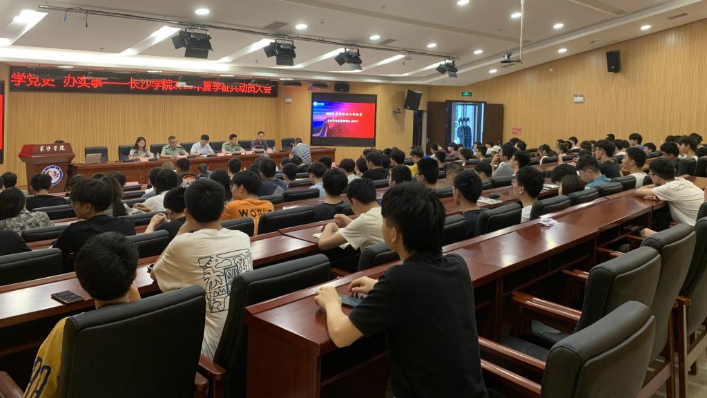 为深入推进党史学习教育、国家安全教育和国防教育,广泛开展征兵入伍宣传工作,全面落实国家关于做好高校在校生、毕业生入伍预征和就业工作的决策部署,6月11日上午,长沙学院“学习党史,筑牢信念;携笔从戎,爱国拥军”夏季征兵工作动员大会在学校新图书馆1楼报告厅举行。本次活动由校武装部主办,机电工程学院承办。党委委员、副校长祝磊,开福区区委常委、人民武装部部长张贻龙上校出席会议,校武装部部长戴伟丁、副部长王成岗,各学院主管武装工作的副书记以及学生代表等共计150余人参加。机电工程学院党总支副书记唐珍妮主持活动。