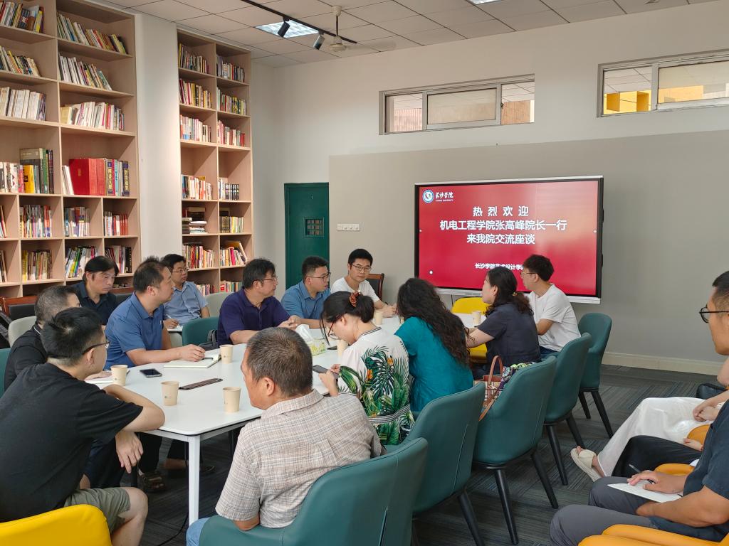 张高峰一行与艺术设计学院院长胡友慧、副院长邓伍英、副院长黄佳、各教研室主任及骨干教师围绕机械类专业与艺术类专业如何深度融合进行了调研交流。