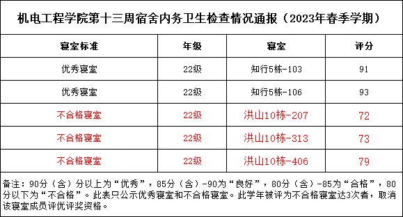 为了加强我院宿舍卫生文明建设,营造良好的学习生活环境,促进学生的健康成长,现将2023年春季学期第十三周宿舍检查结果通报如下: