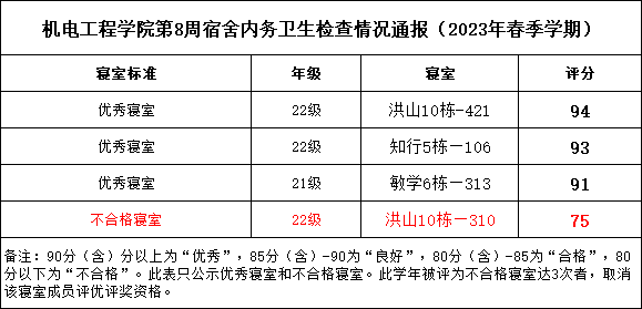 为了加强我院宿舍卫生文明建设,营造良好的学习生活环境,促进学生的健康成长,现将2023年春季学期第八周宿舍检查结果通报如下: