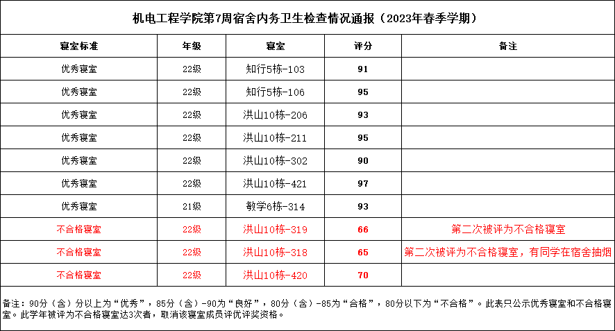 为了加强我院宿舍卫生文明建设,营造良好的学习生活环境,促进学生的健康成长,现将2023年春季学期第七周宿舍检查结果通报如下: