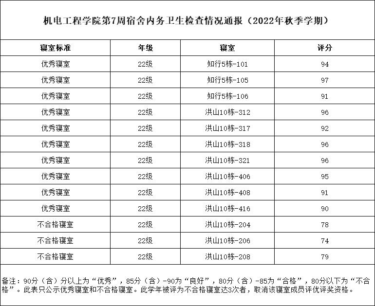 为了加强我院宿舍卫生文明建设,营造良好的学习生活环境,促进学生的健康成长,现将我院2022年秋季学期10月份宿舍检查结果通报如下(第6周为国庆假期,未开展宿舍检查):