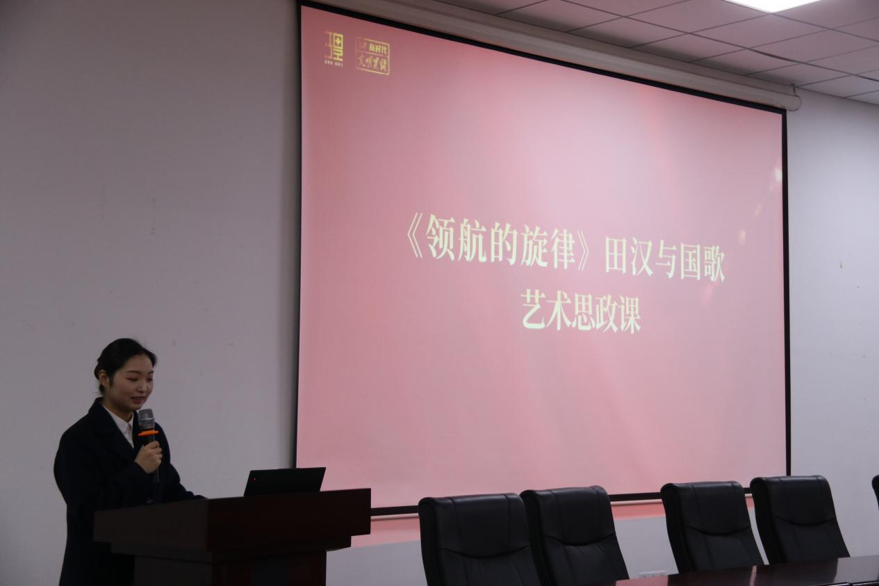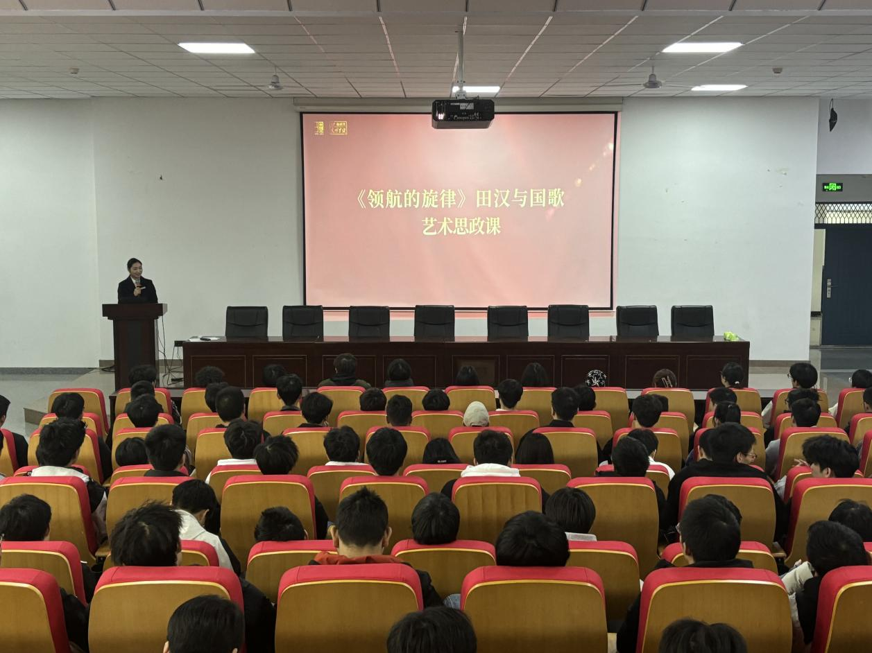 湖南日报·新湖南客户端3月25日讯(柏翀)唱响主旋律,迈向新征程。近日,田汉与国歌艺术思政课《领航的旋律》在长沙学院机电工程学院长智楼C501教室开讲。田汉文化园金欢通过“声、画、音结合”的丰富形式,为机电工程学院的同学们带来了一场沉浸式的艺术思政“金课”。
